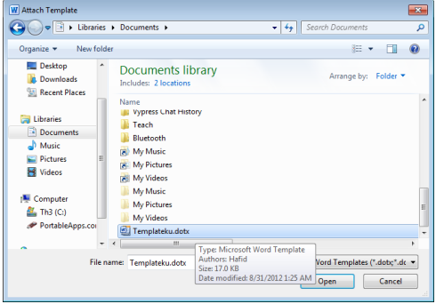 4. Pada jendela Template and Add Ins, Attach atau masukkan template yang ingin kita